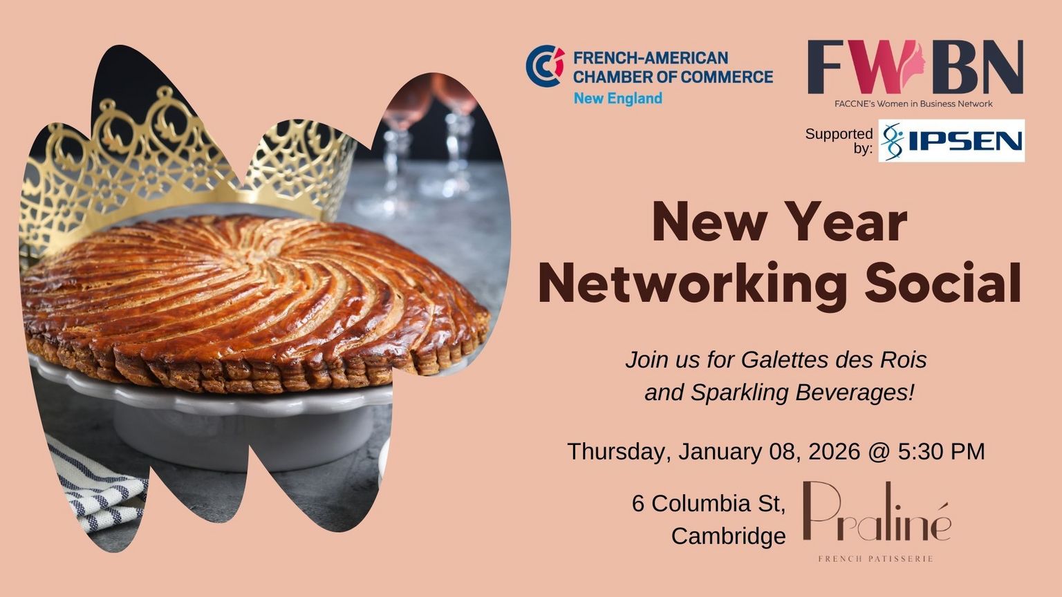 Hosted by Praline, one of Boston's premier french pattiseries, enjoy a slice of their special galettes des roi along with a glass of sparkling wine and other snacks.