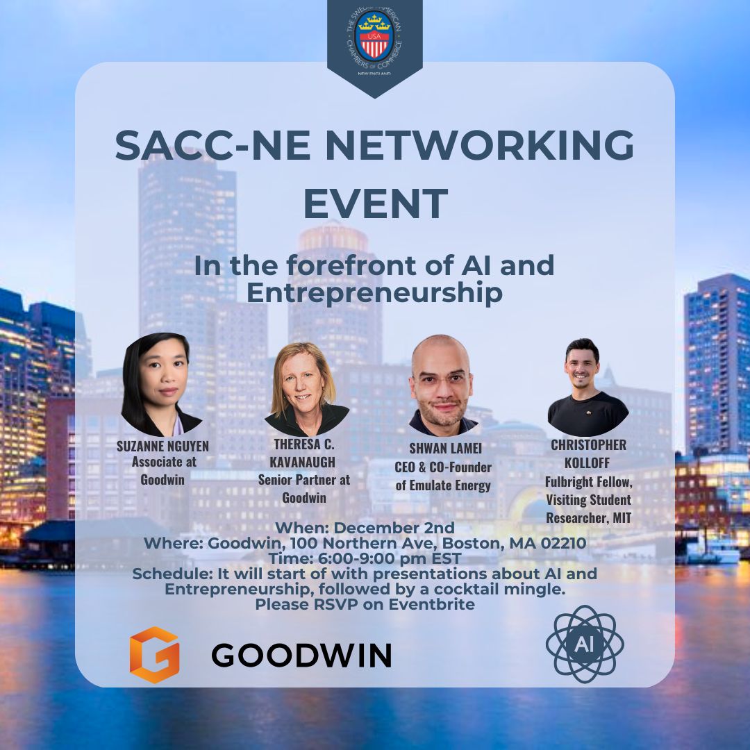 We are excited to share an invitation from the Swedish-American Chamber of Commerce - New England for their upcoming Networking Event together with Goodwin on December 2nd at Goodwin’s stunning office in Seaport, Boston. There will be beverages, food, and snacks to enjoy.