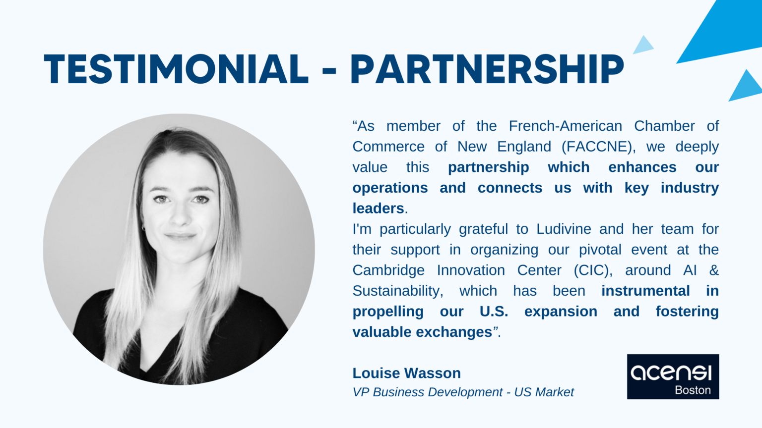 "At ACENSI, support is fundamental. We specialize in digital transformation across the software development lifecycle and have extended our global presence to Boston, leveraging our experience from North America and Europe. As member of the French-American Chamber of Commerce of New England (FACCNE), we deeply value this partnership which enhances our operations and connects us with key industry leaders.